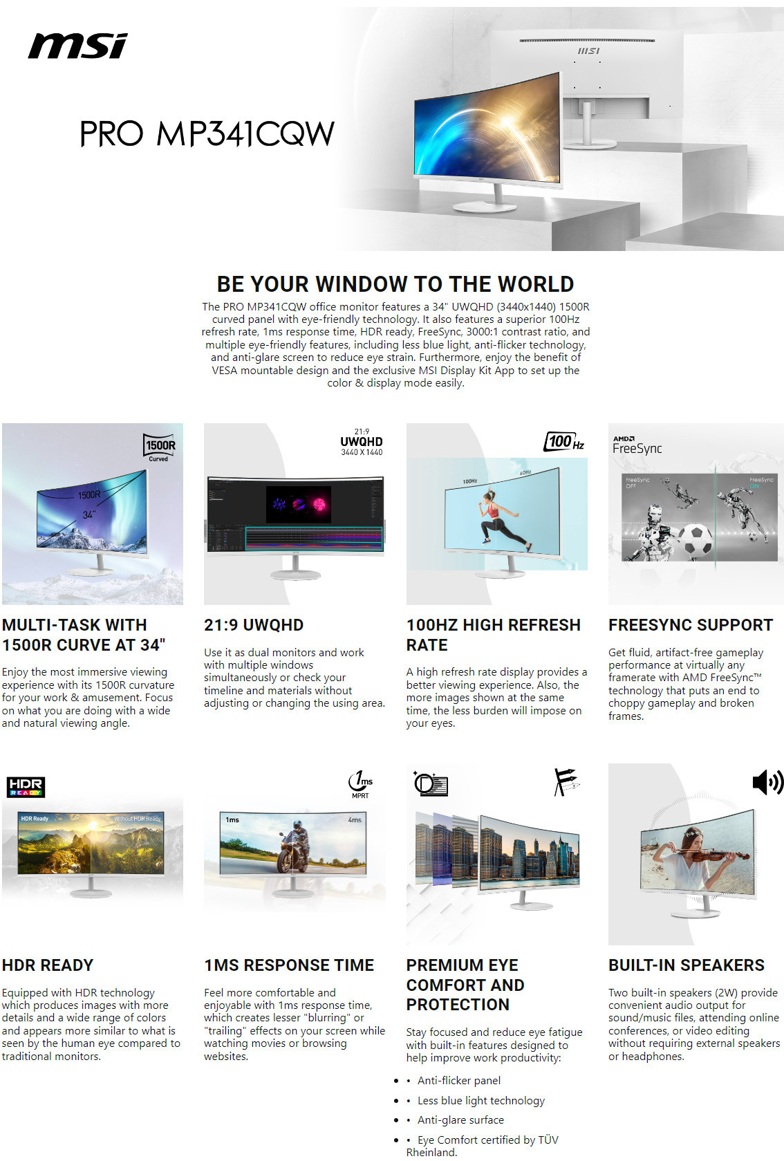 MSI Pro MP341CQW 34″ VA UWQHD 100Hz 1ms Curved White Business Monitor